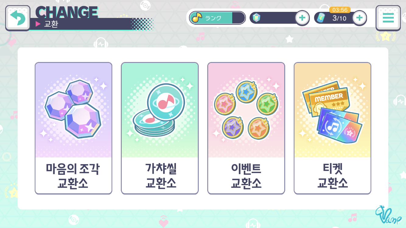 - 이미 소유하고 있는 멤버를 가챠로 획득 시 대기실에서 교환하여 마음의 조각으로 획득하며 마음의 조각을 재화로 사용하는 교환소