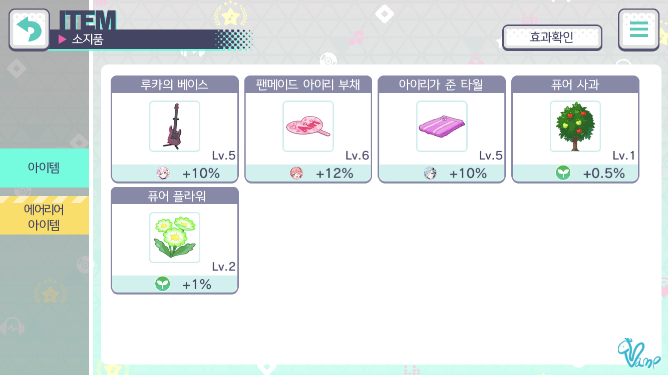 - 효과 확인 : 보유하고 있는 에어리어 아이템들의 종합력 상승 효과를 유닛, 타입, 캐릭터 별로 확인 가능